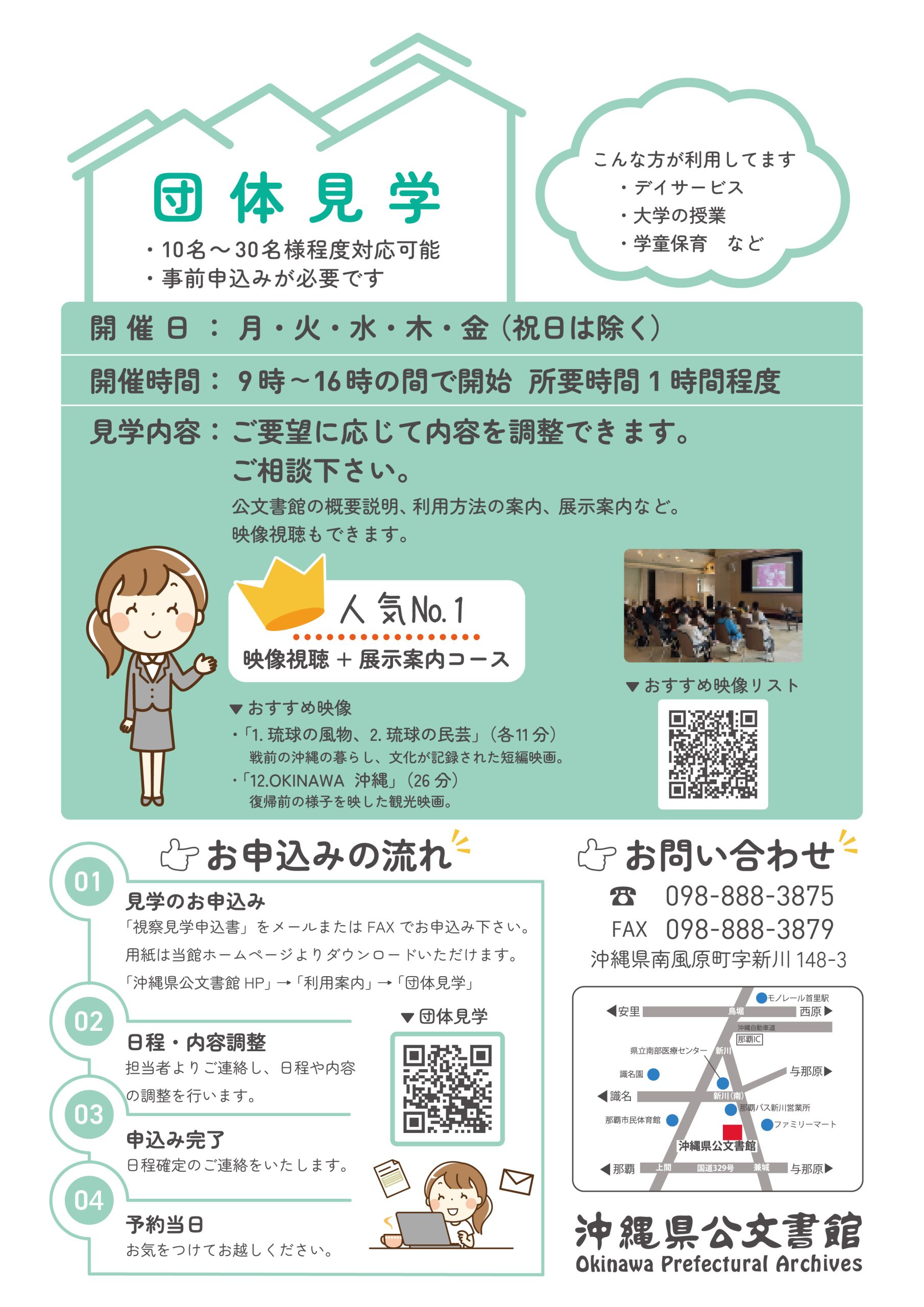 (公文書館の概要説明、利用方法の案内、映像視聴、展示案内など)
